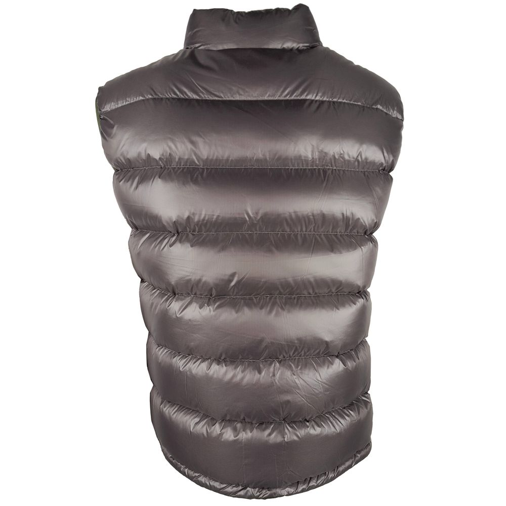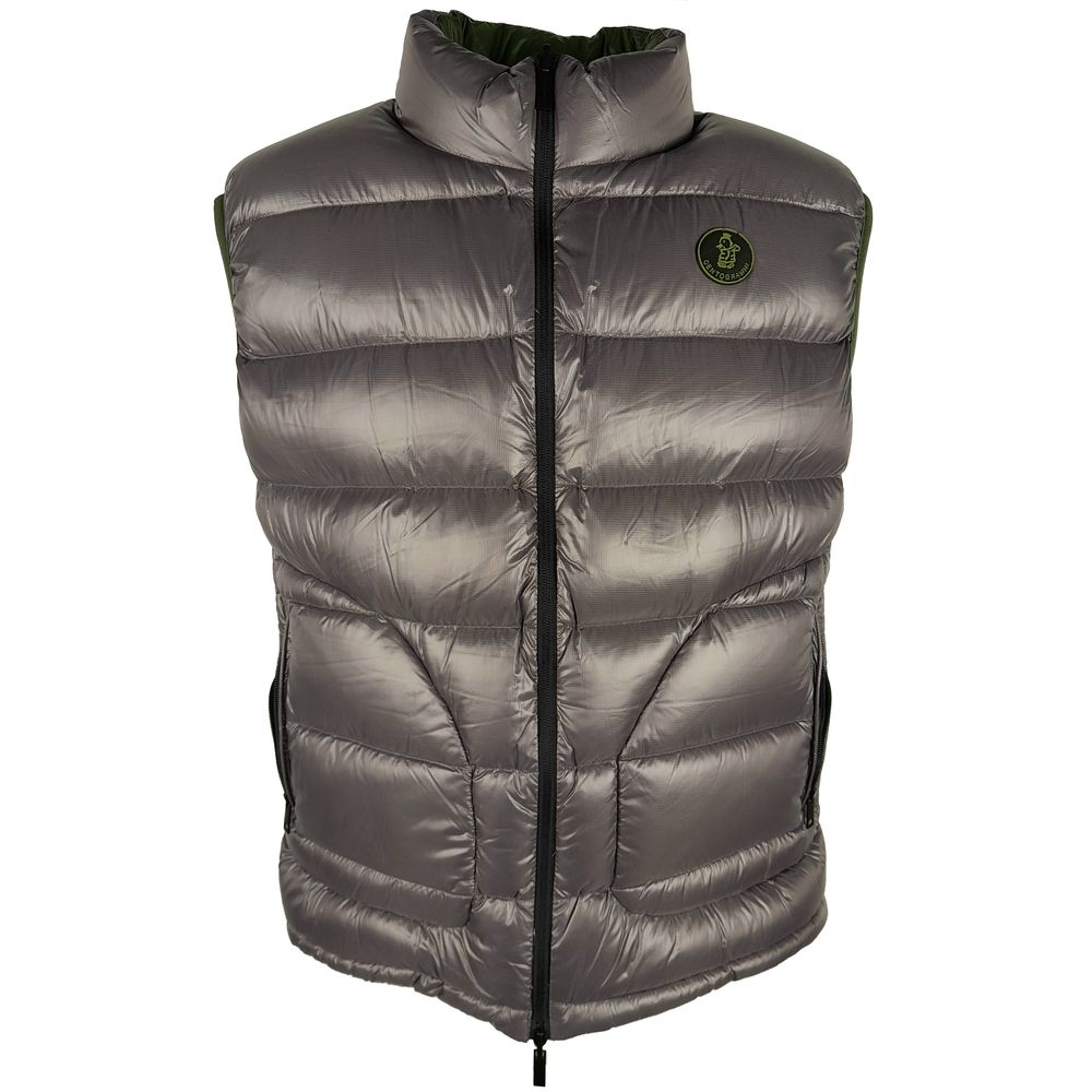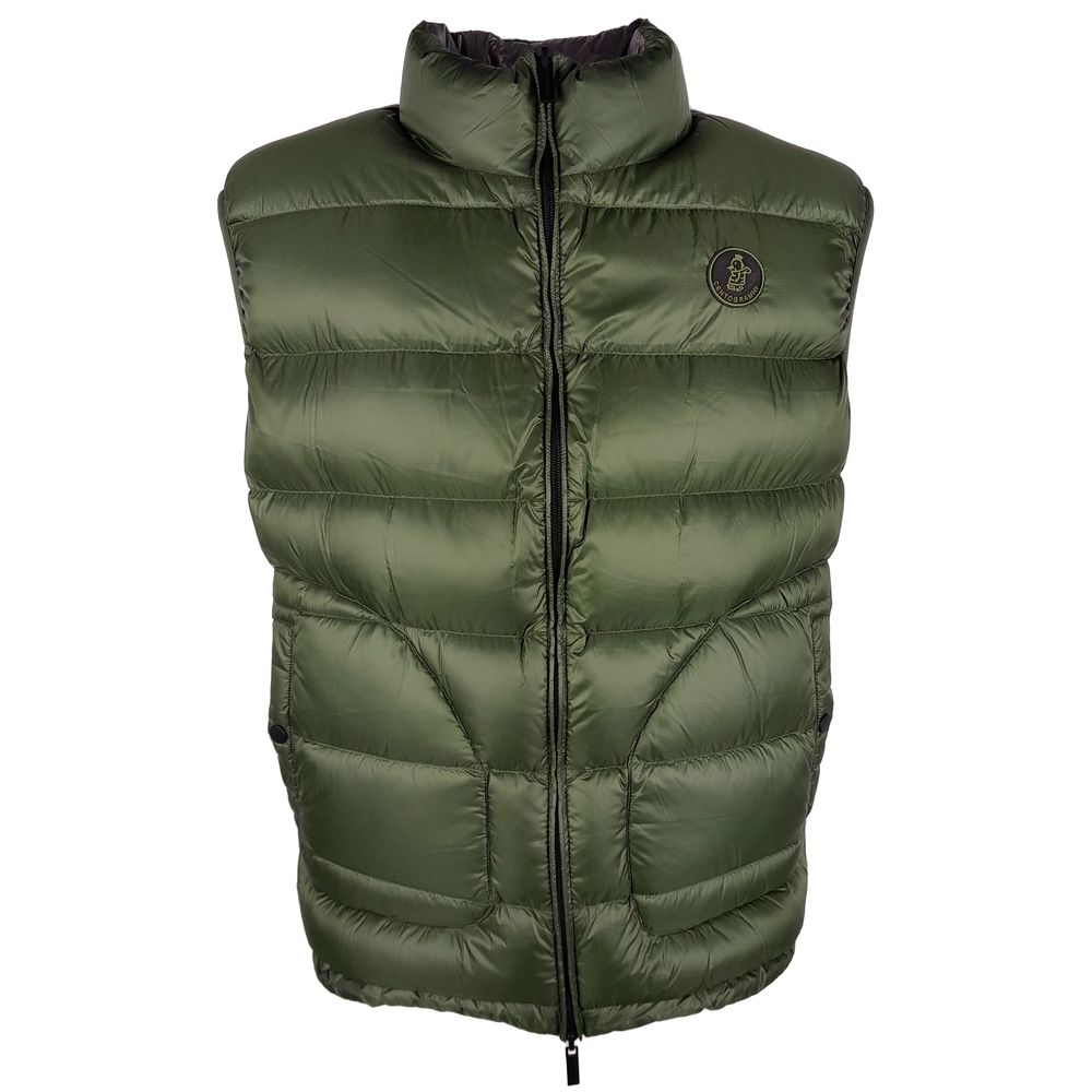 Discover the versatility and warmth of our exquisite reversible vest by Centogrammi. Crafted from luxurious 100% nylon, this green and grey vest offers plush duck down padding, ensuring superior comfort in a sleek package. The vest boasts a smooth zip closure and two practical side pockets with secure button closures. Whether you’re aiming for subtle elegance or making a casual statement, this piece is a testament to masterful design and functionality.