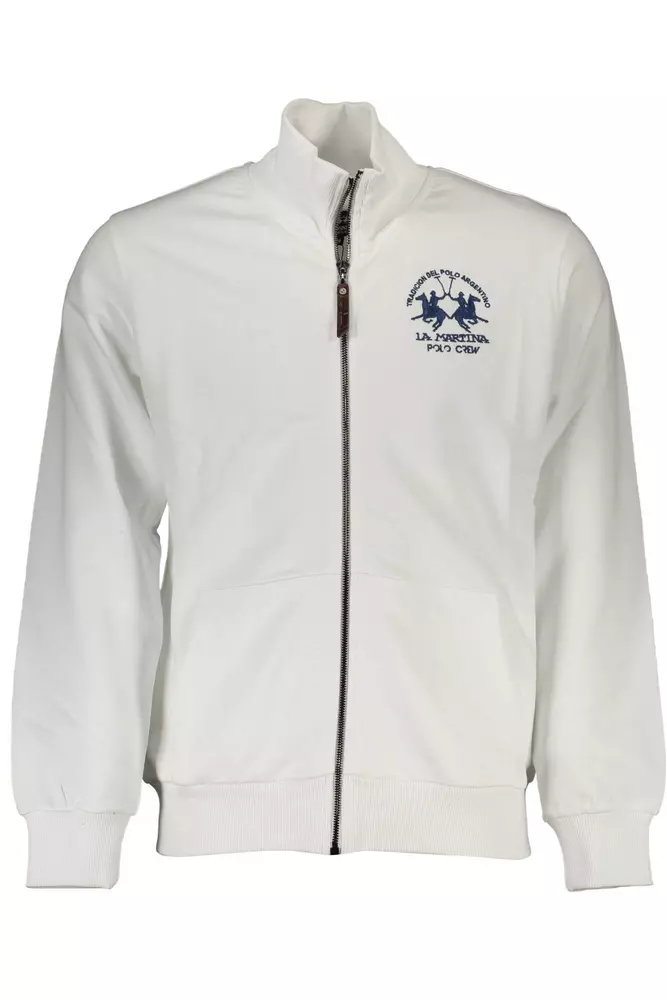 Indulge in the comfort and style of this La Martina long-sleeved sweatshirt, perfect for the discerning fashionista. Elegantly crafted from 100% cotton, it features a convenient zip front, two central pockets for utility, and is adorned with intricate embroidery and the brand’s prestigious logo for that touch of exclusivity.