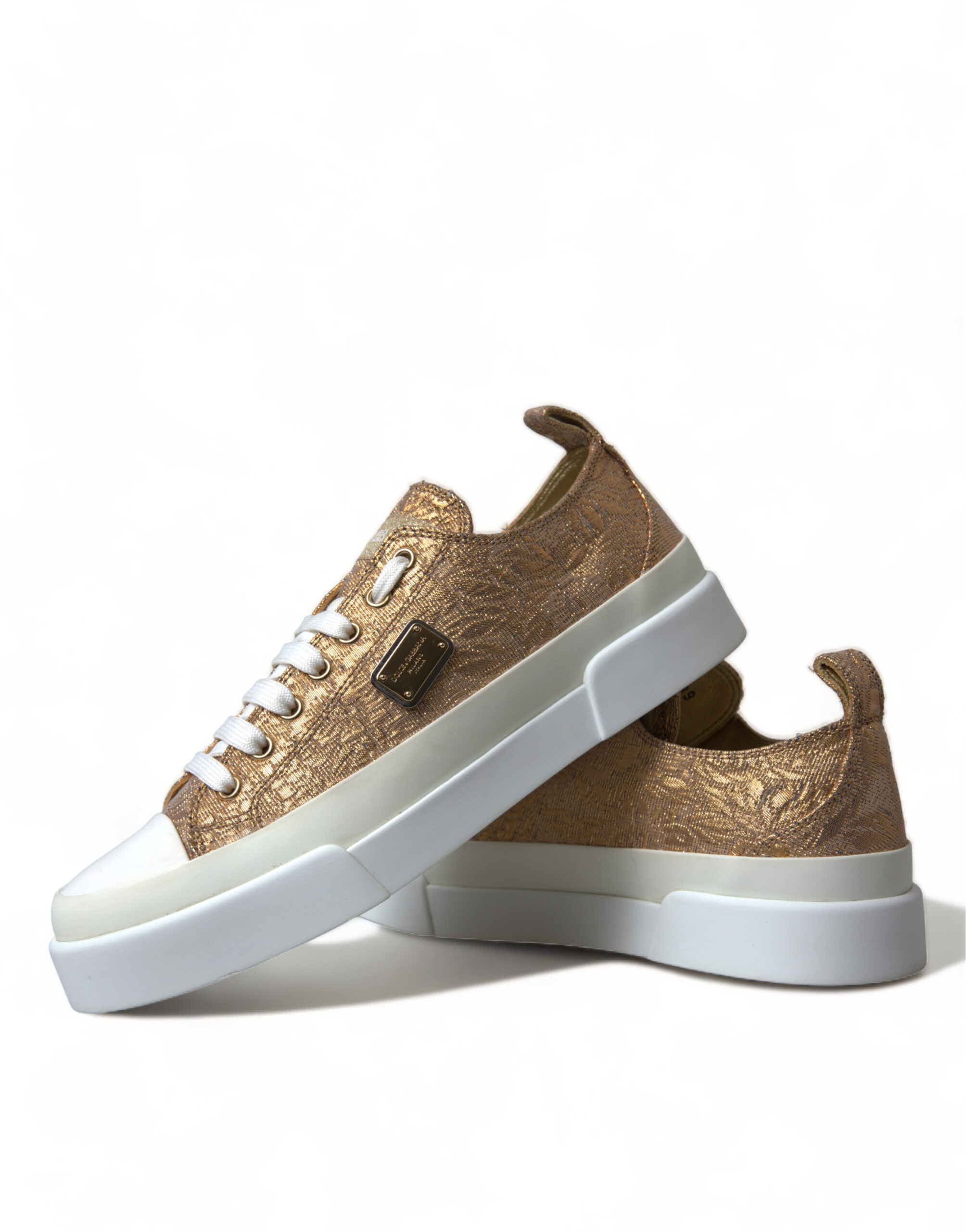 Step into luxury with these stunning Dolce & Gabbana women’s sneakers. Tailored for effortless style, these shoes elevate any outfit with their gorgeous gold and white brocade fabric. Perfect for fashion-forward individuals, they feature a classic low-top silhouette, elegant lace-up fastenings, and the brand’s signature logo details. The robust rubber soles ensure durability and comfort, making them a must-have for your high-end footwear collection. Designed and crafted in Italy, they represent the pinnacle of high craftsmanship that the brand is renowned for.